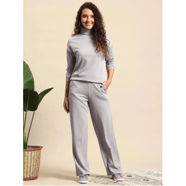 Product Details:Style: Elegant, comfortable co-ord loungewear set in sophisticated grey, featuring a turtleneck top and wide-leg pantsSet Includes: