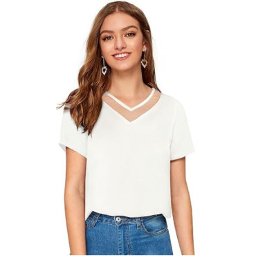 Women Western Insert V-Neck White T-Shirt, Short Sleeve Tops for Woman