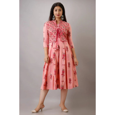 Elevate your wardrobe with this stylish Ladies Floral Print Jacketed Dress, a perfect fusion of comfort and elegance. This dress features a sleeveless inner dress with a beautiful floral print, paired..