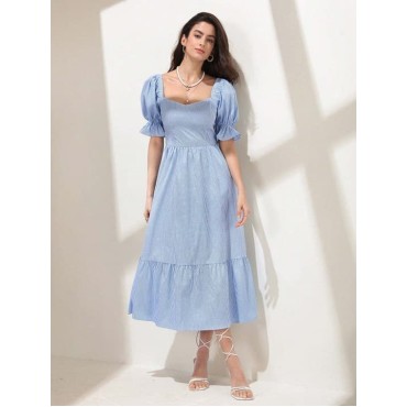 Embrace timeless charm with this beautiful light blue gingham midi dress, perfect for creating effortlessly chic looks.Key Features:- Classic blue and white gingham check pattern- Flattering square ne..