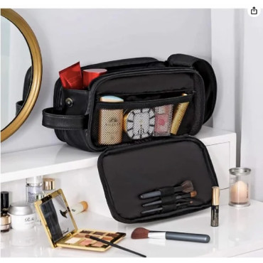 Large Capacity Cosmetic Travel Bag 12 cms, Makeup Kit Storage with Handle, Wide Opening (Black)