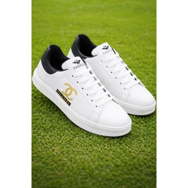 - Colorway: Classic white with black heel counter and luxurious gold logo detailing - Premium synthetic leather upper for a sleek, polished look - Eye-catching gold CC-inspi..