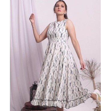 Introducing the Women's Ikat Print Flared Maxi Dress – a perfect blend of traditional craft and modern style.Features:- Fabric: Pure Cotton / Cotton Blend with traditional Ikat weave- Color: Off-..